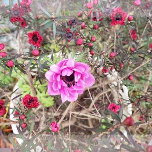 🆙しそこなっていた一枚。 ギョリュウバイの鉢にアネモネの種が飛び、一輪だけ咲きました☺️ ギョリュウバイの枝に支えられるようにして… アネモネだけだとひょろひょろしそうでしたが、こんな自然なコラボもいいかな?と思いました。 ギョリュウバイが大好きなお友達、GSに戻ったら見てくれるかな
