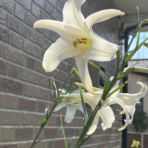 シンテッポウユリ?🤍 フェンスの外から盆栽鉢に種が飛んできて咲いています🤗 2年目だったかな? シンテッポウユリって大きくなるんですね😳160センチの私の背丈より大きくなっていて測ってみたら180センチありました😅 浅い盆栽鉢なのにこんなに大きくなるなんて🫨 綺麗だけど庭で増えたら困るので種ができる前に花がら取ります☹️