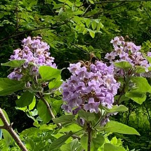もう10m近い樹高に育っている大木です。 昨年、青い実が鈴なりになっていた時に出会い 桐の樹だと知りました。 昨日、初めてお花を見ることができました😊💓 花言葉:「高尚」 📖桐は朝鮮半島を渡って日本に伝わりました。 中国の神話に登場する霊鳥「鳳凰」は、 桐の木にだけ止まると云われます。