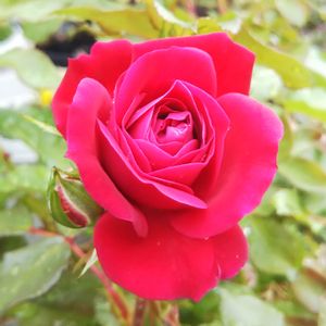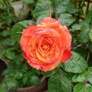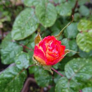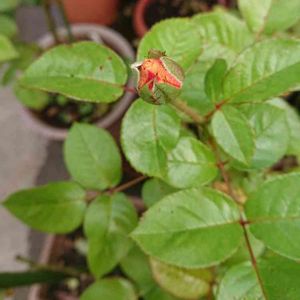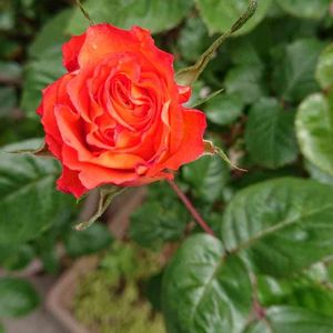 スーリール•ド•モナリザ が開花しました😊 深い赤で照葉で。 モナリザの微笑みというに相応しい堂々たる佇まいです。 香りは微香となっていますが, 近づくとティー系の甘く優しい香りがします。少し桃の様なフルーティな感じも。 モナリザは黒星病にやうどんこ病に強く, 雨に濡れても色落ちしないので育てやすいです。 赤い薔薇がお好きなら一つは持っていて損はないと思います😊 この子もこの冬には鉢増しかな。