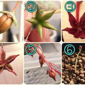 【フォロワーさんからのご質問に答えてみた❣️シリーズ】 ⚠️がば長いけんね(笑) 今回は 「エケベリアの種子の収穫どきがよく分かんない💦」 というご質問です💡 初めてだったりするとネットでブログ読んだりしてもよく分からないですよね〜(^◇^;) こればかりは実際に見るのが一番良いのですが、このご時世そうもいきませんのでpicで説明していきたいと思います(∗︎⚬̀︎ꇴ⚬́︎∗︎)b 先に言っておきますが、picの子房は同一エケベリアの物ではありません。 そこんとこご了承下さい。 あと私自身も実生2.5年目の素人なので、参考程度にしといて下さい🙇♀️ ぶっちゃけ1年目に失敗したおかげで今なんとなく出来てるだけですので、皆さんも1年目は失敗して学ぶつもりでやって下さい(笑) 更に育てる環境で大きく差が出ます。 受粉から種子収穫、種蒔きから発芽、それ以降の生長も株の個体差やお住いの地域の環境でバラバラです。 具体的な指標はありません。 こちらは千葉県北部です。 台風も直撃するし夏はクソ暑く冬は雪も降ります。 そこんとこ踏まえて、ご一読ください(●︎´ϖ`●︎)❤️ ①受粉後約20日の子房 種子できたかな〜❓ 子房がふっくらしてるからできてるかな❓ ②種子が出来、展開し始めた子房 子房が星型に展開し始めたら受粉成功❗️(展開しないタイプもあるよ) でもまだまだ瑞々しく、種子も熟していません🙅♀️ ③まもなく種子が熟す子房 ②に比べて子房の水分もなくなりシワシワかさかさな様子が見てとれます。 私はこのくらいになるまで花芽に付けたままにして自然乾燥します。 裂け目から種子が見えてますね❤️ ④完全に乾燥し、種子も熟した子房 カッサカサです。 ここまで放置すると風で揺れただけで種子は全部溢れておじゃんです😭 ③くらいで収穫しておきましょうね✨ ⑤受粉成功しても子房が展開しないタイプ ①と比べてカサカサになり、しっかりと乾燥していますね。 これくらいで収穫しましょう。 展開しないからといって放置しすぎると子房ごとブッ飛んだりカビたりします。 ⑥種蒔き用土 うちは黒いビニポに3分の2まで硬質赤玉の小粒、残り3分の1の半分イセキの種蒔き用土、その上に芝の目土を振るって微塵を落としたものです。 消毒はめんどいので省略、種蒔き後霧吹きで水やりしダコニールしゅっしゅ、これだけです。 問題なく発芽しますがカビや菌など気になる人はまあ、しっかりと土を消毒、殺菌とかしても良いと思います。 ただね…めんどいよ、マジに❗️(笑) あとオルトランね❗️ 赤玉土の上に蒔きましょう。 オルトランの前に赤玉土だけでも微塵を洗い流しておくと腰水の水が汚れなくていいよd(*¯︶¯*) ポリシーとして ・種子の選別はしない ・カッスカスの種子でも一応蒔いてみる もあげときます。 生命誕生は神の領域、ヒトが決める事ではありません。 一見発芽しなそうな種子も、とりあえず蒔きます。 それで芽が出たこともあります、たった5個でしたが(笑) とりあえずやってみてください❗️ 全ての物事、初めから大成功する人は稀‼️ 質問随時受け付け( ⸝⸝⸝⁼̴́▽⁼̴̀⸝⸝⸝)💓 分かることなら出来る限りお答え申す❗️ 苦情、文句はスルーな💀🖤(笑)