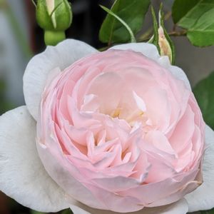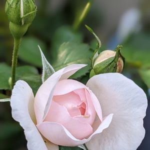 暑い日🌞でした🥵 そんな中、薔薇がポツンと咲きだしました✨ 今の季節は咲かせない方が良いのでスマホで撮った後カット🙂 ブランピエールドゥロンサールは春はもう少し🩷ピンクが濃かったような… どちらも春より小さなお花です🤗