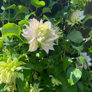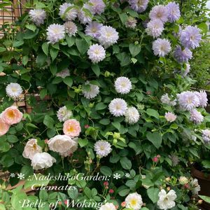 クレマチス ベル オブ ウォーキング🎵 三年目でようやく蕾が30個位の着きました😊✌️ 沙羅の幹に絡め作戦も成功‼️😊 ただこの時期になると沙羅の葉っぱがワンサカ繁り、陽当たりが⤵️花色が薄くなりますね、、 まっいっか、、←これ、得意です😂