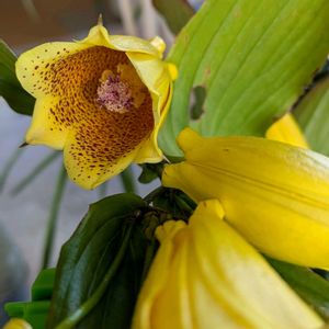 ジョウロウホトトギス 綺麗な黄色🟡の花に紫💜の点々。 夏の暑さ続きで葉っぱが焼けてしまいました。