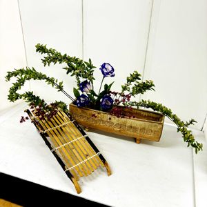 生け花 木組との調和を生かしたデザイン 木は3本もクロスし、自立で立てるような状態にし、合わせて花を生けてみました💐