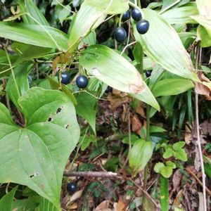 ヤブミョウガでしょうか?。高尾山、陽当たりの良い1号路、湿り気の多い日陰の感じの6号路共に登って、降りてくるまで全部に生えていました。黒い実や、まだ熟さない青い実、ちょっと白っぽくなったグレーの実もありました。枯れてきていた葉っぱ🌿もありました。 山の紅葉🍁は、まだ少ししているくらいでした。 ホウチャクソウ🌱と教えて頂きました😊ありがとうございます🎀