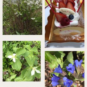 こんにちは〜雨☂️の一日。 🎂ケーキ屋「ベンベヤ」さんの マザーズベリーロールケーキ❣️ ☕️コーヒーTime❣️ 娘がお花で出来たケーキを探したけれど無くて‼️ 食べれるケーキ🎂でお祝いしてくれました💓 ↖️ユキヤナギ雨に濡れてる姿も 良いです♡ ↙️オオバナのエンレイソウ♡ 少しずつ小型になってる❗️ ↘️去年咲かなかった プルモナリア 「カリビアンブルー」💙 小さいけれど濃い色で感激しました💕。
