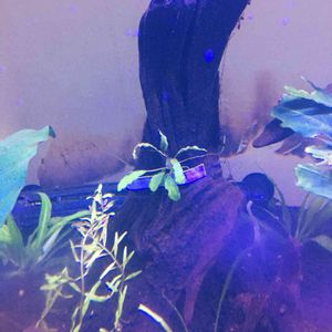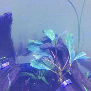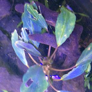 お、2匹しか入れてないエビちゃんが せっせと葉っぱのお掃除してくれてます どこにいるかわかるかな? 写真に反射してる青系の色は水草の 育成に必要な青系ライトの光です