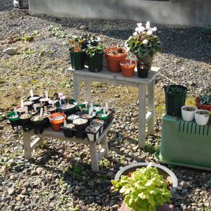 涼しくなってシクラメンが芽を出し始めたら、避暑地の日陰ベランダから 庭先に、棚ごとガタゴトお引っ越し(^.^)ここは朝日だけが入ります。 まだ直射光にあてるのはきついかな〜