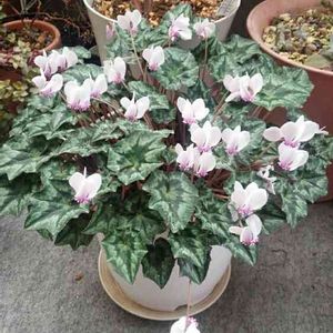 原種シクラメン タイルバーンニコラス ニコラス独特なツリー模様が綺麗で銀葉です。そこそこ大きくなってきました。 晴れればもっと綺麗に撮れるのになぁ。