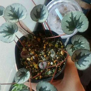 数カ月前に買った原種シクラメン タイルバーンニコラス 赤色に見えますが赤色で銀色の光沢感がある自慢の株です。