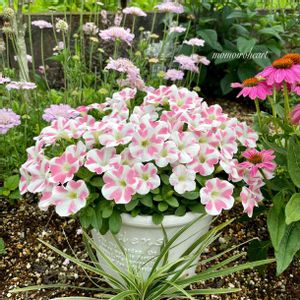 我が家の夏の定番😆 サフィニアももいろハート💕😆 ハンギング、素焼鉢で10株満開です〜😆 ハートクッキリ💕かわいいね😊