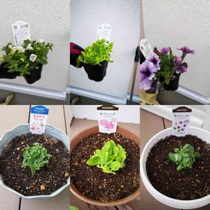 6月5日 曇り☁️ 昨日の雨☔️はすっかり上がり これから晴れま☀️がみられそうなお天気ですー♡ 5月5日に、お迎えした サントリーサフィニア バイオレット💜 イエロー 💛 サントリーサフィニアアート江戸しぼり💟 お花がチラホラ咲き出しましたー♪ 手前右側の鉢は、✂️切り戻しした桃色ハート💓 左側の鉢は、何度か✂️したタピアンー💜 どれもまだまだまだ、満開とはいきませんが… 元気なようで何よりですー😻 満開目指してがんばれ➰🎌😽