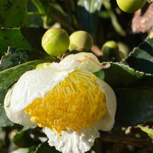 山茶花ではなく、茶々でもない⁉️ お茶の花です 楚々と咲いていて、目立たないけど、白くて 黄色いおしべがいっぱい、頑張ってます💛
