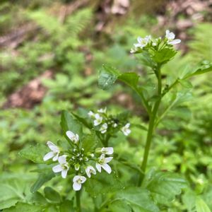 ヒロハコンロンソウ🌸 (広葉崑崙草) アブラナ科タネツケバナ属 (4/11by裏高尾) 湧き水が流れ出る場所に有り。大きさ的にはマルバコンロンソウよりずっと大きく30cmくらい🧐美味しそう😋 .☆.。.:.+*:゚+。 .゚・*..☆.。.:* 山地の湿った場所に生える越年草(秋に発芽し越冬して翌年に花が咲く植物)。高尾山では渓流沿いに多く見られる。山野草のなかでは背が高く、群生するのでよく目立つ。花は白く、十字のような形。直径は約1センチだが、茎の先にたくさんかたまって咲くので全体が白く見える。葉は羽状複葉(うじょうふくよう)といって鳥の羽のように柄(え)の両側につく。葉の形は瞳のような楕円形でふちに大きな鋸歯(きょし:葉のふちにあるノコギリの歯のようなギザギザ)がある。葉の柄のもとにある茎を包む耳のような突起が特徴で、同じ白い花をつけるコンロンソウの仲間と見分けるときの目印になる。別名は「タデノウミコンロンソウ」。栃木県日光湯元の「蓼の湖(たでのうみ)」で最初に見つけられたことに由来する。 (599ミュージアムHPより抜粋)