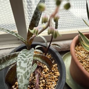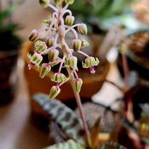 レデボウリア(豹紋)とプラムの蕾で、 🏷️金曜日の蕾たち に参加します🎵😄 レデボウリアは、お花が咲いているものもあります😃✨ 小さいけどシベの紫色がキレイなお花です❣️