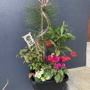 明けましておめでとうございます🎍 今年も、宜しくお願いします😊 去年の松🌲と南天、マンリョウ シクラメン、ジュリアンで 寄せ植えを作ってみました。 二枚目目は、さつま椿 今期初のお花を咲かせてくれました。