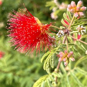 🔴ベニゴウカン(紅合歓) 真紅の長いおしべが固まってつく様子は、繊細で独特な美しさがあります。ブラシノキの先だけのような花です。 ⚫︎マメ科 カリアンドラ属 ⚫︎原産 北アメリカ ⚫︎花期 5月〜10月