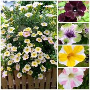 おはようございます☺️ 左・花友さん宅のもりもりに咲いているサフィニアと、右上2つはとても個性的なペチュニアです🎶 下の2つは、我が家のサフィニアです🤗 今からの季節、カラフルなお花で庭が華やかになります😄