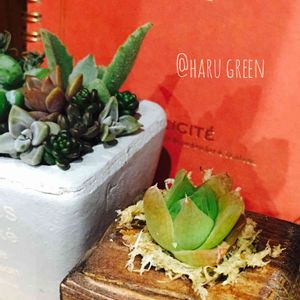 こんにちは🎶 茨城県笠間市『kinomi』 イベント風景です。 ウッドキューブには 60mm角と38mm角の 2週類あります□ 写真左の クラッスラ属『若緑』は 制作して2年間以上経ちました🌳 若緑は『芳香の強い黄色い花』を 開花させます。 何か香るなーって感じたら😁 若緑です(笑) 『みどりのまとめ』も 見てもらえたら嬉しいです🌵
