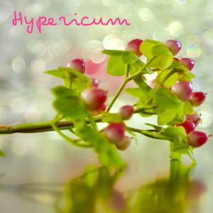 ヒペリカムをテーブルに横たえ、後ろにガラス花瓶を置いて見ました(╹◡╹)