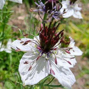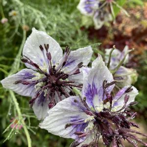 ニゲラ アフリカンブライド 中心に近い顎が紫色で、コントラストが綺麗💜🤍🌿 久々の雨を受けて、蕊が重そうですね。