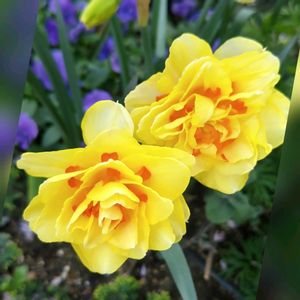 我が家の八重咲き水仙 タヒチが咲きました🧡 花びらの中に埋もれたオレンジ色の蕊かしら? 玄関前で2花姉妹でお揃いの開花になりました💛
