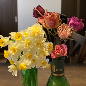 早速かざり~の クンクンし~の、、、 黄色い子はちょっと、、、な香り 白い子はさすが かほりすいせん、とついてるだけあって、いい香り✨✨✨💓 お花の大きさが ずいぶん違ってる😲😆