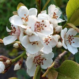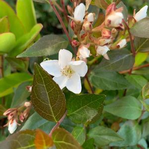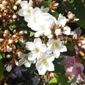 バスターミナルの植え込みの低木に白い可愛らしいお花が咲いています。冬場は黒っぽい実を沢山付けるこの植物は…調べたところ〜 『車輪梅』と言う名前と判明😊毎年この時期はこのお花がバスターミナルの主役です🥰