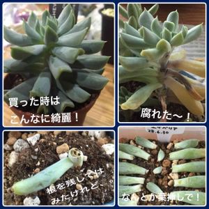 6月末に購入した 「クラウド」さんが〜〜😭 蒸れたんでしょうね、 気付いたら、腐れてきちゃいました😣 急いで大丈夫そうな葉を葉挿しに。 ダメもとで、 根と茎をのこしてみたけれど。 我が家には1株しかないクラウドさん! なんとか絶えないで〜〜😫