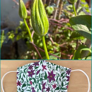 クレマチスのつぼみが大きくなってきました。 これは鉢植えですが、庭地植えのクレマチスも全て新芽が確認できました。 何が起ころうとも強く生きてますね、、、 下はクレマチス柄マスク! 材料はダイソーです。 夜な夜な作りました。 最近は派手柄マスクにはまってます。