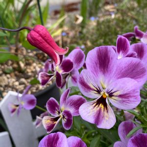 クレマチスVSビオラ この写真を見ていると、写楽の浮世絵の大谷鬼次と市川男女蔵をイメージする… ビオラがデカくて遠近感が変?な感じですが、この大きさで正解です。