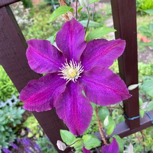 クレマチス ミニベル。 今年新設のラティスに絡みながら咲いてます。 隣街の園芸店で半額セール中。 バラ苗が欲しくて行ったけど、バラは買わずに多肉植物を買ってしまった… そして一緒に行った家族がナゼかバラ苗2鉢購入。 よくわからない買い物でした。