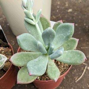 今は青っぽさがほとんどない青星美人。淡い黄緑に少しだけピンクに紅葉した姿は,おそらく一年中で一番色が薄い姿。 これが真冬になると濃い赤紫に変身するとは今の姿からは想像できない。年間を通して色の変化が激しく,楽しませてくれる品種。 去年,群生していたのをカットして子株を横に並べて管理中。