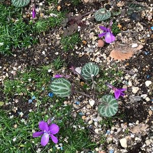 可愛いスミレが店先で発砲スチロールに植えられていました 縞の葉が変わってて初めてみたスミレです