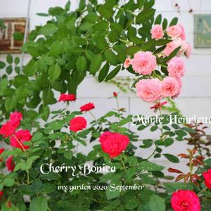 四季咲きのつるバラのマリーヘンリエッテとチェリーボニカです。明るいピンクと赤がお庭を明るくしてくれます(*˘︶˘*).。.:*♡ どちらもとっても病気に強い品種です。