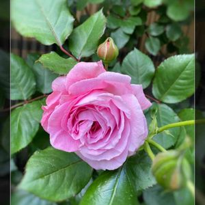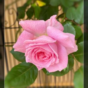 今朝のマリーヘンリエッテです。つるバラです。今年の春にお迎えして地植えにして、今、1.5mくらいです。ものすごく病気に強い子です。 立てて誘引しても足元から花を咲かせると書いてあったけど、まだ、先端にだけ房咲きになっている感じですねえ。。とっても明るくて可愛らしいピンクです♥お庭が明るくなる感じです。