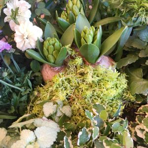 緑花白花の寄せ植え。 寒さでシーズンオフに入った子たちを冬越し鉢へ移動しました。 代わりに、芽出しヒヤシンスを仲間に。 球根が見え過ぎると寒々しそうだから、セダムのお布団。