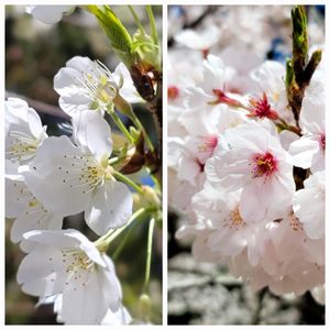 萩城跡指月公園に🌸を見に行ってきました。 約600本のソメイヨシノ🌸がほぼ満開状態で、もう言葉では表せないほどの美しさ‼️ その中に左側のミドリヨシノも咲いていました✨ 右側のソメイヨシノのはなびらがうっすらピンクなのにたいしてミドリヨシノは真っ白なのがわかるでしょうか? そしてミドリヨシノはガクも緑色。 国内では萩でしか見られない珍しい🌸のようです☺️ 風が強くて🤳撮るのが難しかったけど、楽しいひとときでした💮