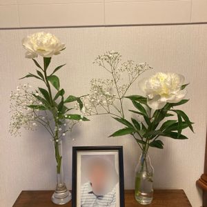 2023年5月23日 火曜日 18年前に55歳で亡くなった弟の祥月命日。我が家では仏花ではなく季節の花を一輪挿しで供えています。 白い芍薬と霞荘。芍薬は前日蕾だったものが翌日夕方にはこのように。