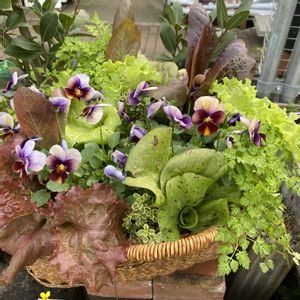 園芸店の寄せ植えに魅せられました✨ サラダ菜とビオラの寄せ植え 素敵な発想てすね♡
