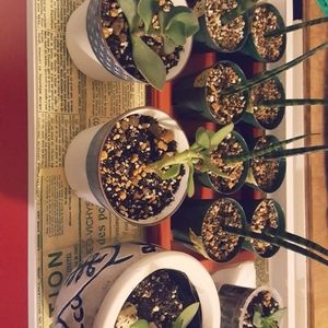 金のなる木をダイソー盆栽鉢に植え替え。 切り苗だったけど、ちゃんと根っこ生えてた‼ 嬉しい😃🎶