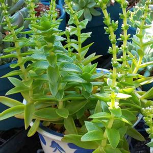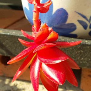 クラッスラ属 火祭り🌱 暑さ寒さも彼岸まで。とは良く言ったものですね。日中の暑さも和らいで、今朝は夏衣装では肌寒かったほど😅今は秋晴れ☀午後から下り坂模様の晴れの国です。昨晩2ケースと今朝2ケースに水やりしました🎶 picは火祭り。炎天下で伸び放題に夏越しした2鉢を先日まとめて植え替えました。ハナラーだった頃に使っていた花柄の陶器鉢を引っ張り出してきて再利用🤭昨年は早々に花芽をカットして仕立て直したんですけど、今年は「ええい!ままよ!」とそのまま手荒く鉢まとめ😂ゆえに今年は咲かせます(笑)開花までしばらくかかりそうですが💦 燃え立つような赤色になるのが楽しみな子です🤩 あ、そうだ!火祭りの光を昨夏から育ててるのにみどりのまとめに記録し忘れてる😱 「たっちんの火祭り」タブをタップで生長記録のみどりのまとめが簡単に見れます😊🎵 「多肉ラボ©」参加のお申し込みは、1/17のブロンズ姫の投稿からお願いします🤗🌱