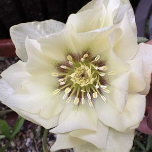 クリスマスローズダブル 1枚目 1番花 2枚目 2番花 3枚目 全体 4枚目 夜に玄関までゴミ出し準備しようとしたら大きな植木鉢が棚から落ちて割れてました プラ鉢は落ちただけです 拾い集めて戻しました 焼物植木鉢🪴あらまぁガッカリ スマホのライト🔦で片付けました 残念すぎる〜⤵️