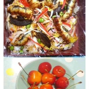 うなぎチラシ寿司 ⇔ さくらんぼ🍒 お隣さんにお孫さんが産まれました。お祝いにうなぎチラシ寿司を作ってお持ちしたら、今日、キレイなさくらんぼ🍒のお裾分けがありました。 嬉しかったです🍒🍒