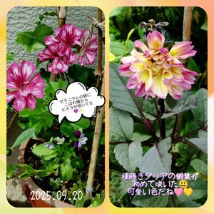 ここ数日は雨も多く気温も下がり何となく秋めいて来ています。 涼しくて夜もエアコン無しで寝られるって やはり身体が休まるなぁと感じます。 でも日中お日様が出るとまだ暑くて、今日も最高気温は32℃。 種蒔きダリア可愛い色が咲きました。 ゼラニウムの鉢の根元に?何かな見たらこぼれ種からのビオラが咲いていた。 9/15に種まきを少ししたら、発芽🌱してました。 が、ビオラはまだ1本も出ていない💦 一晩位しかペーパーで挟んで水に浸さなかったからもう少し掛かるかも。 まあ、のんびりでいいや。😊 今日から彼岸の入りですね。 彼岸花が丁度良い時期に咲いてるようです。