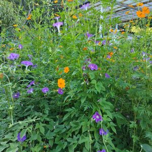 こぼれ種から… ①フェンスに巻き付いて毎朝沢山のお花が咲いている朝顔です😄 向こうの方に小さく見えるオレンジ色のお花は、同じくこぼれ種でわんさか咲いているキバナコスモスです❇️🧡🧡❇️😅 ②今朝もまた真っ白な朝顔も咲いていました☘️🤍☘️🤗