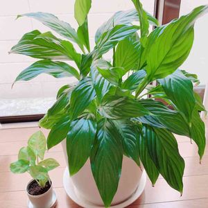今日のお花 スパティフィラム 横にあるのは最近100均で買った シンゴニウム 葉脈がちょっと赤いです🍀 スパティフィラムはあまり花が咲かせられていません💦葉はよく茂りますがね(//∇//)