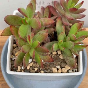 こんにちは♫ 春とは言え、今時期に降る雨は凄く冷たいですね😅 本日の1枚は、名前が渋い✨この子!!クラッスラ属 義経の舞です♫ 我が家にやって来た頃は、真緑だったのですが😅野外で管理をしていたら!少しづつ良い色合いになって来ました♫ 多肉さんはカッコイイ名前の子が多いです🥰