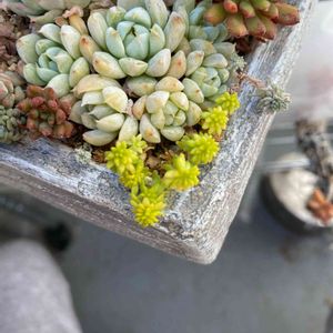 大量質問失礼します。 寄せ植えに入っていた多肉植物ですが、 どなたか名前わかる方いましたら、 教えてください🙇♂️ 黄色のセダム?のようなものです。